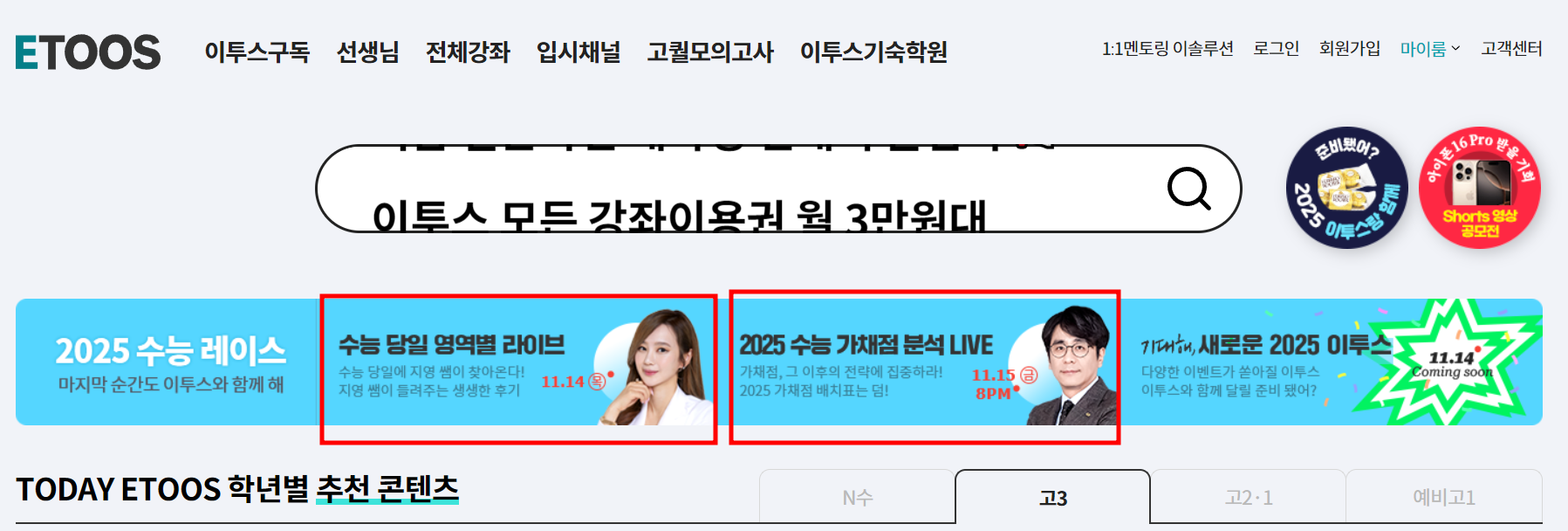 이투스에서는 당일 영역별라이브와 가채점 분석을 통해, 앞으로 남은 수능 원서 접수 전략을 제공하게 됩니다.