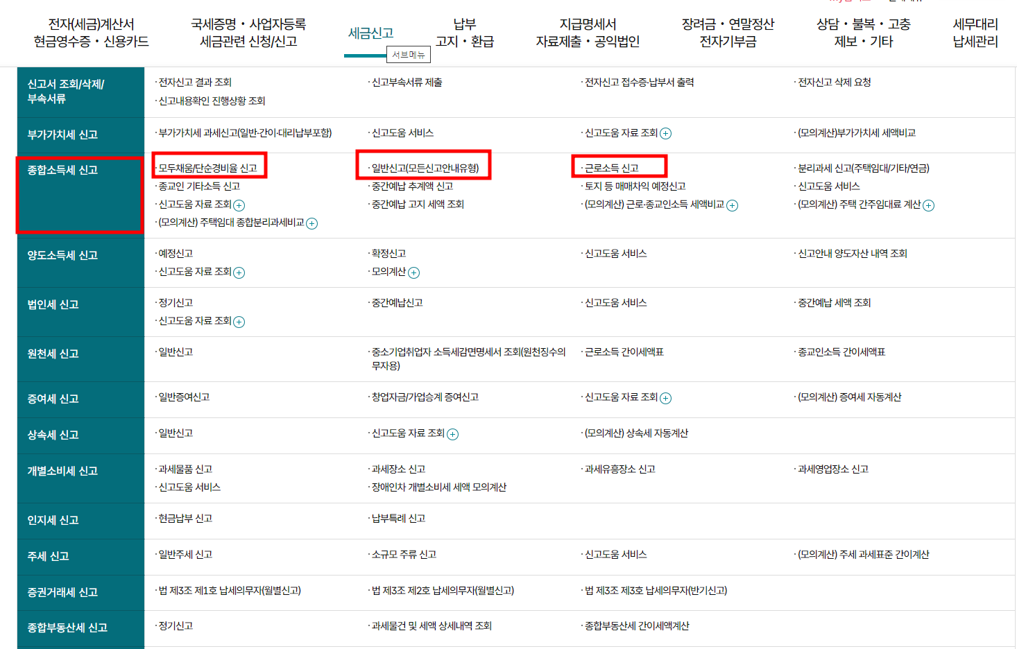 - 신고서 작성: "신고/납부" → "종합소득세" 메뉴에서 안내에 따라 신고서를 작성합니다.