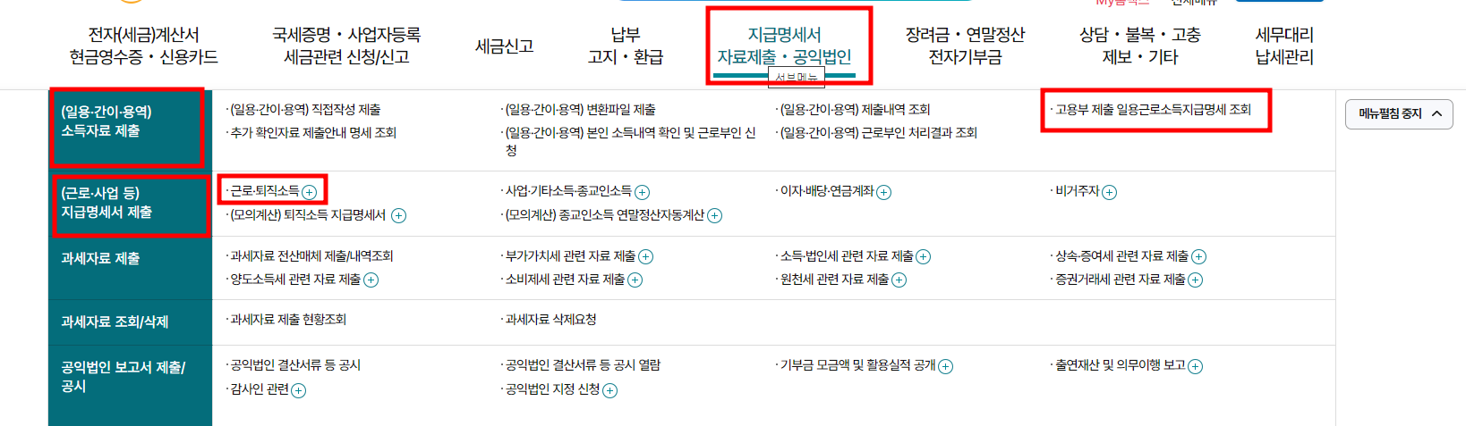 - 소득 확인: "조회/발급" → "소득자료 조회"에서 소득 내역을 확인하세요.